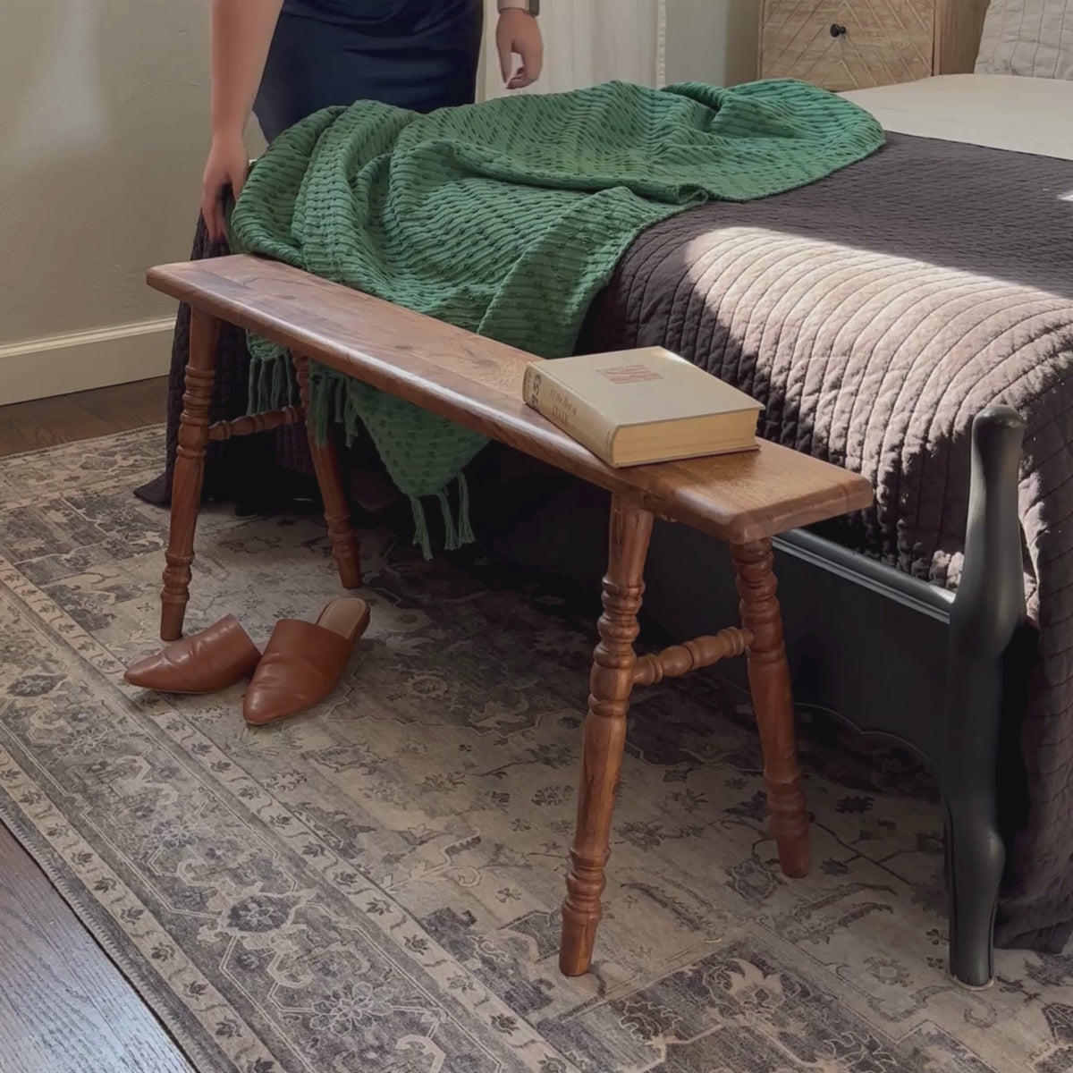 Solid wood craftsmanship and refined turned legs offer a familiar, inviting touch. Positioned at the end of the bed, our Ember Bench blends timeless style with everyday functionality, perfect for seating or layering linens. Its narrow, backless silhouette is an easy add that brings character to your bedroom retreat.