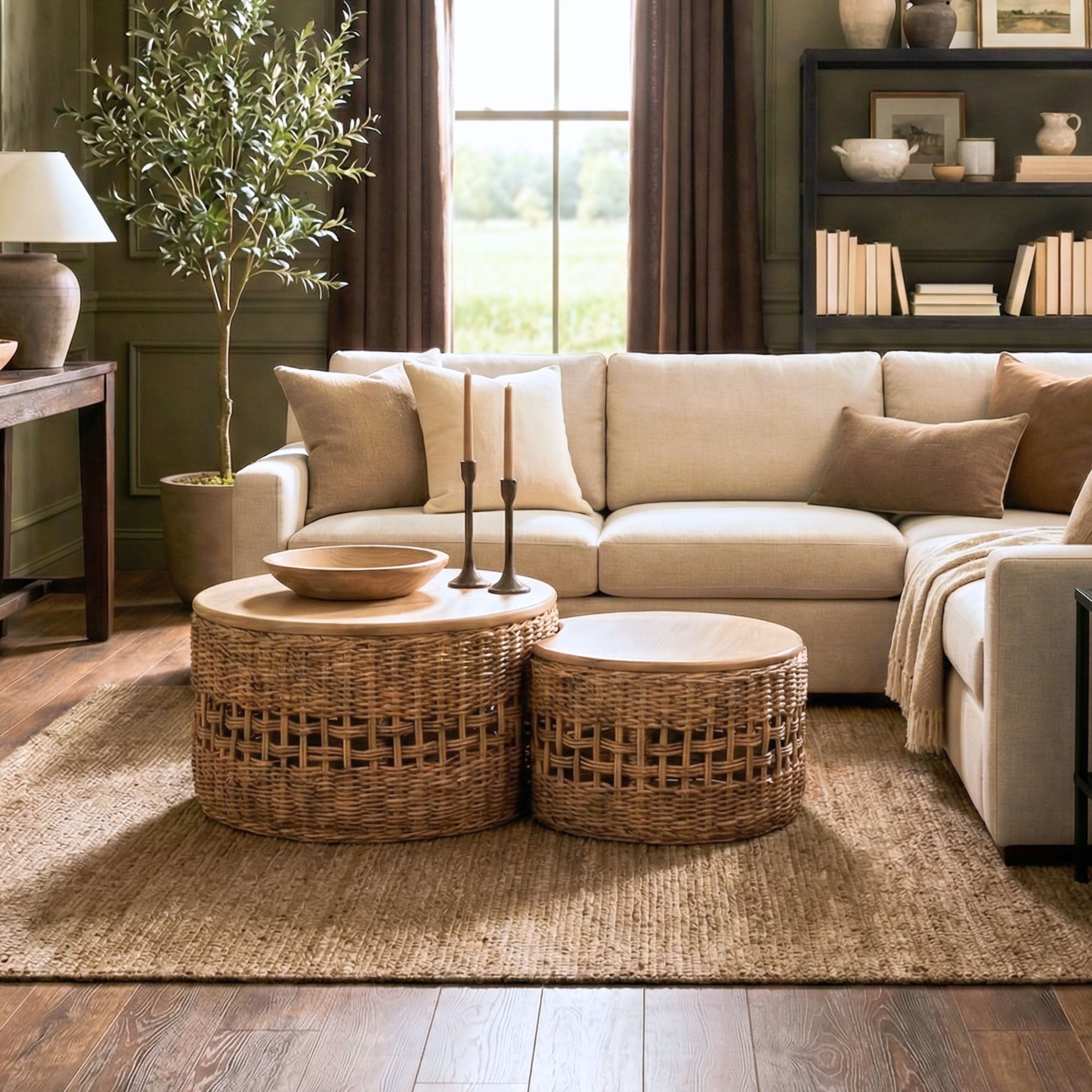 The center of the room deserves to be the center of attention. Our coffee tables are handcrafted from rattan, live-edge wood, solid teak, and recycled coconut shell, built to anchor your living room and start more than a few conversations.