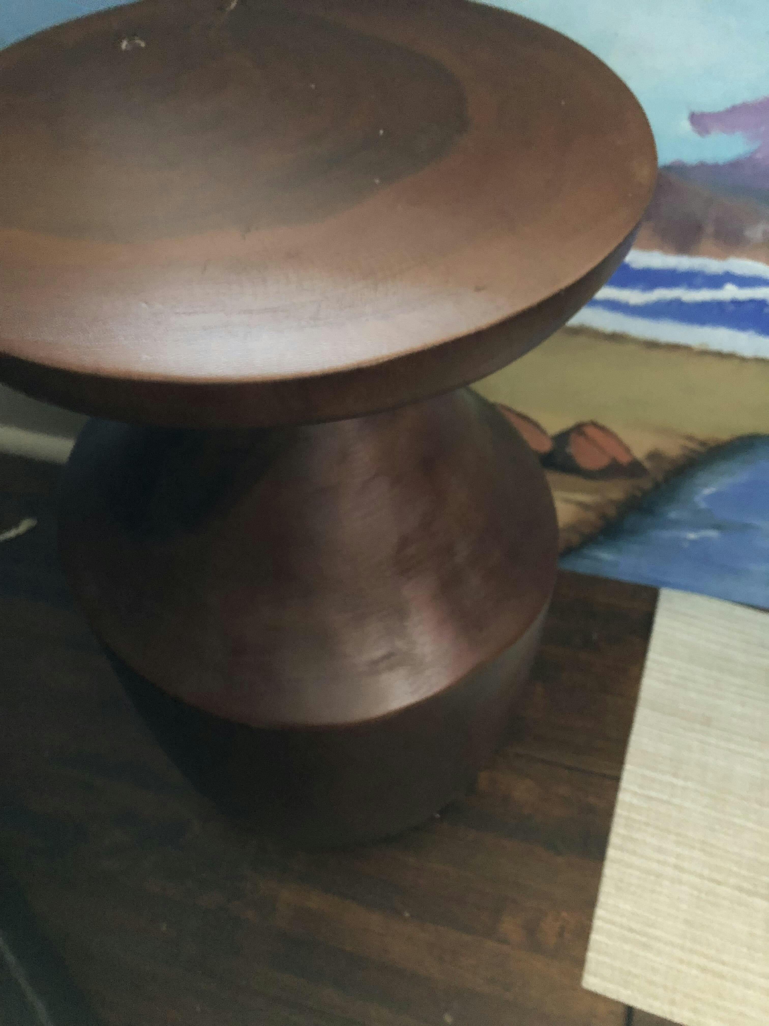 The organic, asymmetrical curves and slim neck of this cinched sculptural side table are enhanced by the warm Munggur wood, crafting a unique shape with natural elegance. The graceful lines and warm-toned, solid wood showcase the balance of modern organic simplicity and bold transitional style.